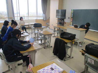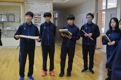 3年生は、修学旅行で行った観光大使活動のまとめ発表を行いました。3つのグル-プに分かれて、実施後のアンケ-ト結果などを基に、利尻島に観光客を増やすためにできることを考え発表しました。参観してくださった来賓の方から、「中学生らしい新鮮な発想がとても良かった」「利尻の強みや弱みを見つけ分析できていることが素晴らしい」など、たくさんの激励をしていただきました。