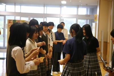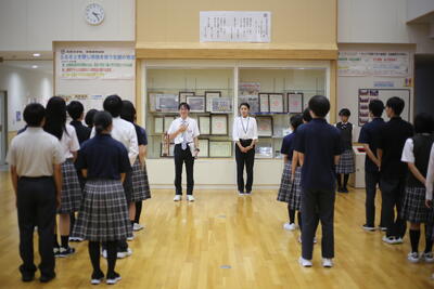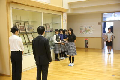 本日は、今週来ていた2名の教育実習生の最終日でした。お別れ集会を行い、生徒代表からの感謝と激励の言葉があり、写真撮影をしました。2名の実習生からは、「この学校にずっといたくなるくらい、充実した5日間でした。良い先生になれるよう頑張ろうという気持ちになりました」との挨拶がありました。