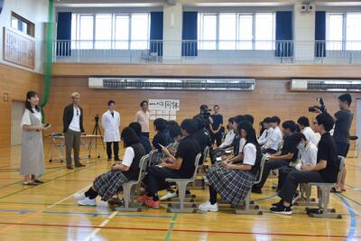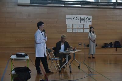 8月29日(金)の全校集会(6校時)に、江頭2時50分さんがサプライズで登場しました。新作アイス(みかん味)を食べてもらうという企画で利尻を訪れ、その途中で利中に来校しました。子供たちは驚きましたが、アイスを試食し「おいしい!」と反応したり、江頭さんとの交流を楽しんでいました。